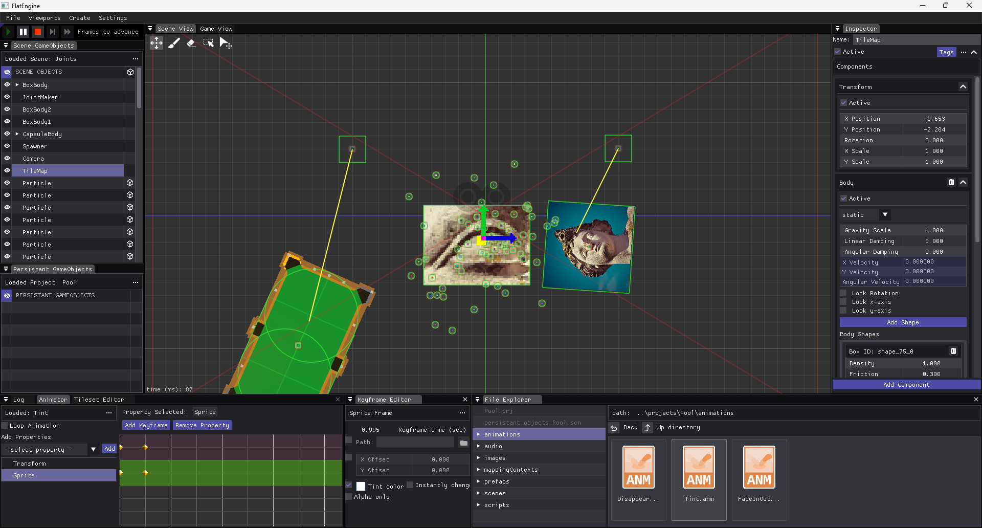 FlatEngine2D is a 2D game engine I developed. Check out the GitHub repo for more details: